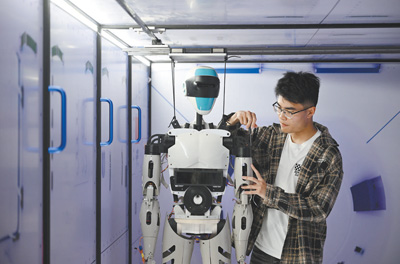 浙江湖州市南太湖新区的浙江大学湖州研究院实验室内,科研人员对人形机器人进行调试。